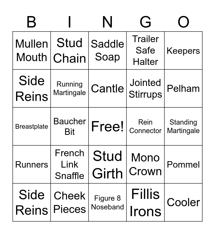 This bingo card has a free space and 29 words: Side Reins, Cavesson, Baucher Bit, Crank Noseband, Mullen Mouth, Saddle Soap, Running Martingale, French Link Snaffle, Rein Connector, Cheek Pieces, Standing Martingale, Cooler, Figure 8 Noseband, Fillis Irons, Pelham, Flash Noseband, Stud Girth, Runners, Keepers, Breastplate, Mono Crown, Fulmer, Jointed Stirrups, Side Reins, Trailer Safe Halter, Stud Chain, Pommel, Cantle and Billets.
