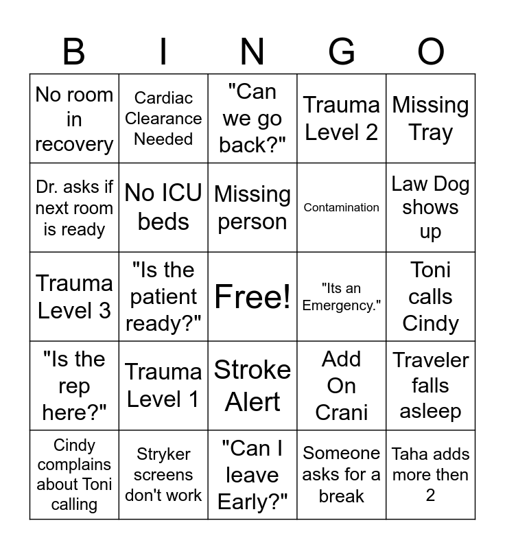 This bingo card has a free space and 24 words: Trauma Level 1, Stryker screens don't work, Missing person, Cindy complains about Toni calling, Missing Tray, No room in recovery, Dr. asks if next room is ready, Cardiac Clearance Needed, "Its an Emergency.", Stroke Alert, Contamination, Trauma Level 3, Add On Crani, Traveler falls asleep, No ICU beds, Someone asks for a break, Toni calls Cindy, "Can we go back?", Law Dog shows up, "Is the patient ready?", Taha adds more then 2, "Is the rep here?", Trauma Level 2 and "Can I leave Early?".