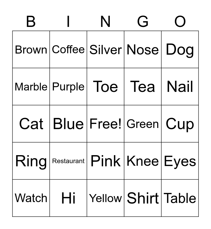 This bingo card has a free space and 30 words: Hi, Bye, Blue, Black, Brown, Silver, Purple, Pink, Green, Yellow, Cup, Table, Shirt, Pants, Nail, Finger, Knee, Ring, Restaurant, Dog, Cat, Glass, Coffee, Tea, Marble, Nose, Eyes, Watch, Toe and Shoe.