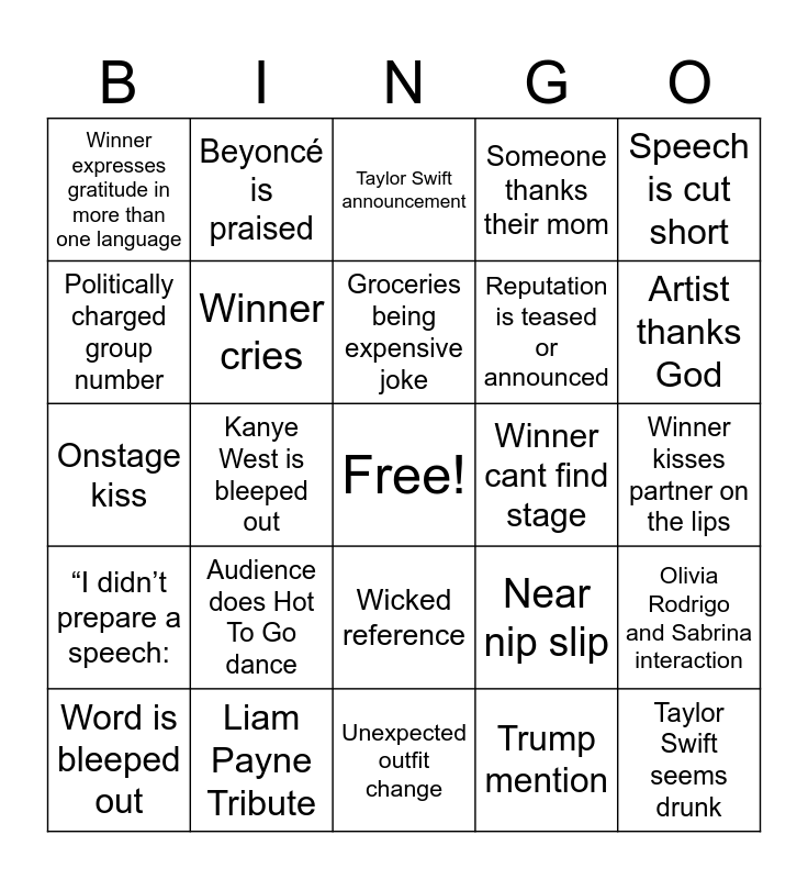This bingo card has a free space and 34 words: Eras tour mention, Trump mention, California fires mention, 1st time Grammy Winner, “I didn’t prepare a speech:, Winner cries, Speech is cut short, Word is bleeped out, Beyoncé is praised, Fire flame on stage, Groceries being expensive joke, Taylor Swift announcement, Woman in a tux, Trevor Noah joke doesn’t land, Winner cant find stage, Artist thanks God, Liam Payne Tribute, Onstage kiss, Audience does Hot To Go dance, Near nip slip, Wicked reference, Audience boos someone, Winner expresses gratitude in more than one language, Winner kisses partner on the lips, Unexpected outfit change, Taylor Swift seems drunk, Someone thanks their mom, Winner is someone nobody has heard of, Reputation is teased or announced, Politically charged group number, Blue Ivy appearance, Kanye West is bleeped out, Olivia Rodrigo and Sabrina interaction and Obvious lipsyncing.