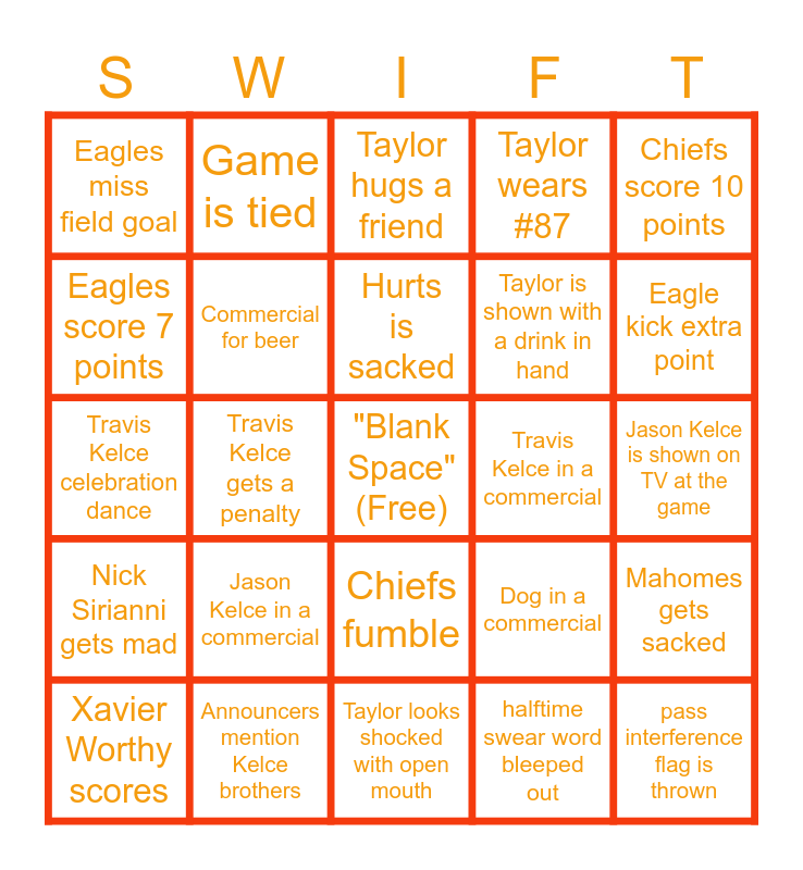 This bingo card has a free space and 29 words: Xavier Worthy scores, Andy Reid smiles, Travis Kelce gets a penalty, Doritos commercial, Eagles miss field goal, Taylor hugs a friend, Commercial for beer, Jason Kelce in a commercial, Travis Kelce in a commercial, Announcers mention Kelce brothers, Jason Kelce is shown on TV at the game, pass interference flag is thrown, Taylor looks shocked with open mouth, halftime swear word bleeped out, Eagle kick extra point, Eagles fumble, Chiefs fumble, Nick Sirianni gets mad, Chiefs score 10 points, Travis Kelce celebration dance, Dog in a commercial, Celebrity, other than people in Taylor's box, is shown, Taylor is shown with a drink in hand, Eagles score 7 points, Taylor wears #87, Game is tied, Mahomes gets sacked, Hurts is sacked and Saquon Barkley scores.