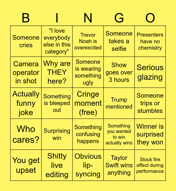 This bingo card has a free space and 24 words: Surprising win, Shitty live editing, Someone is wearing something ugly, You get upset, Presenters have no chemistry, Someone cries, Camera operator in shot, "I love everybody else in this category", Trump mentioned, Something confusing happens, Show goes over 3 hours, Actually funny joke, Something you wanted to win actually wins, Winner is surprised they won, Why are THEY here?, Taylor Swift wins anything, Someone trips or stumbles, Trevor Noah is overexcited, Serious glazing, Something is bleeped out, Stock fire effect during performance, Who cares?, Someone takes a selfie and Obvious lip-syncing.