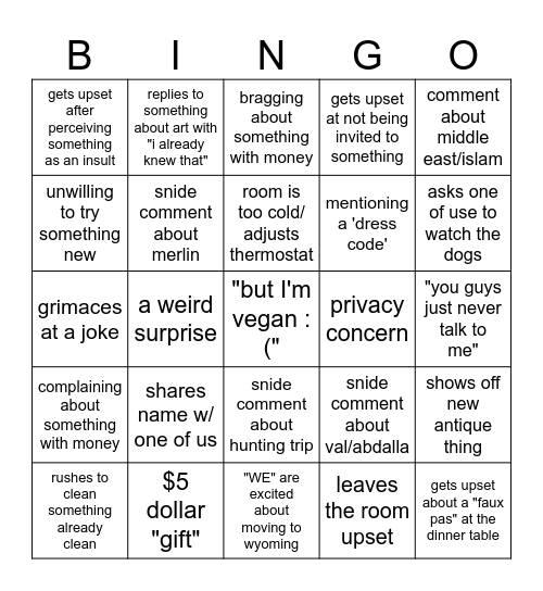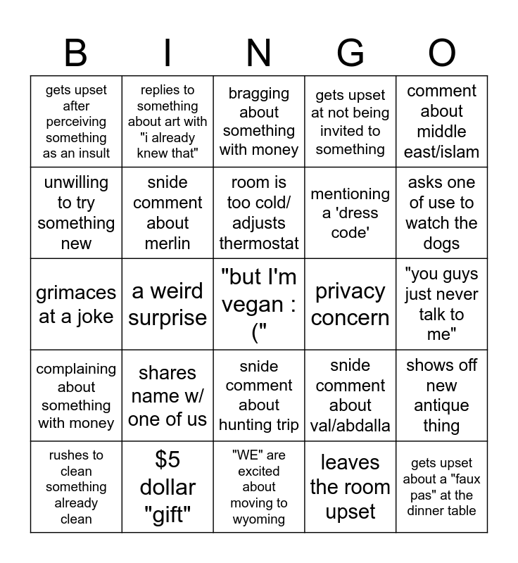 This bingo card has a free space and 24 words: shares name w/ one of us, $5 dollar "gift", room is too cold/ adjusts thermostat, rushes to clean something already clean, comment about middle east/islam, gets upset after perceiving something as an insult, unwilling to try something new, replies to something about art with "i already knew that", privacy concern, snide comment about hunting trip, mentioning a 'dress code', grimaces at a joke, snide comment about val/abdalla, shows off new antique thing, snide comment about merlin, leaves the room upset, "you guys just never talk to me", bragging about something with money, asks one of use to watch the dogs, a weird surprise, gets upset about a "faux pas" at the dinner table, complaining about something with money, gets upset at not being invited to something and "WE" are excited about moving to wyoming.