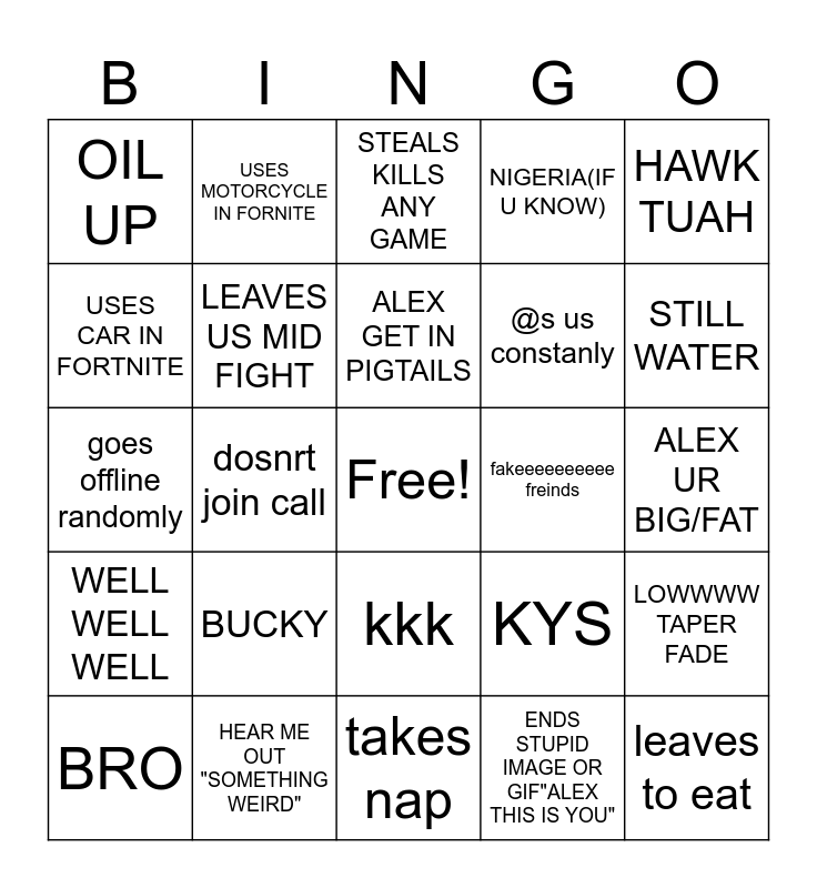 This bingo card has a free space and 24 words: BUCKY, HEAR ME OUT "SOMETHING WEIRD", ALEX GET IN PIGTAILS, BRO, HAWK TUAH, OIL UP, USES CAR IN FORTNITE, USES MOTORCYCLE IN FORNITE, fakeeeeeeeeee freinds, kkk, @s us constanly, goes offline randomly, KYS, LOWWWW TAPER FADE, LEAVES US MID FIGHT, ENDS STUPID IMAGE OR GIF"ALEX THIS IS YOU", ALEX UR BIG/FAT, STEALS KILLS ANY GAME, STILL WATER, dosnrt join call, leaves to eat, WELL WELL WELL, NIGERIA(IF U KNOW) and takes nap.