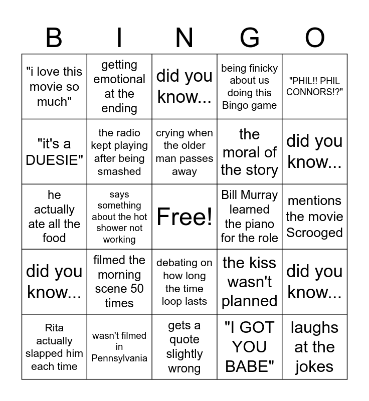 This bingo card has a free space and 24 words: filmed the morning scene 50 times, wasn't filmed in Pennsylvania, crying when the older man passes away, Rita actually slapped him each time, "PHIL!! PHIL CONNORS!?", "i love this movie so much", "it's a DUESIE", getting emotional at the ending, Bill Murray learned the piano for the role, debating on how long the time loop lasts, the moral of the story, he actually ate all the food, the kiss wasn't planned, did you know..., the radio kept playing after being smashed, "I GOT YOU BABE", mentions the movie Scrooged, did you know..., did you know..., says something about the hot shower not working, laughs at the jokes, did you know..., being finicky about us doing this Bingo game and gets a quote slightly wrong.
