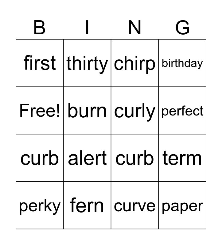 This bingo card has 16 words: fern, term, chirp, first, curb, thirty, curb, curve, Free!, burn, perky, birthday, alert, perfect, curly and paper.