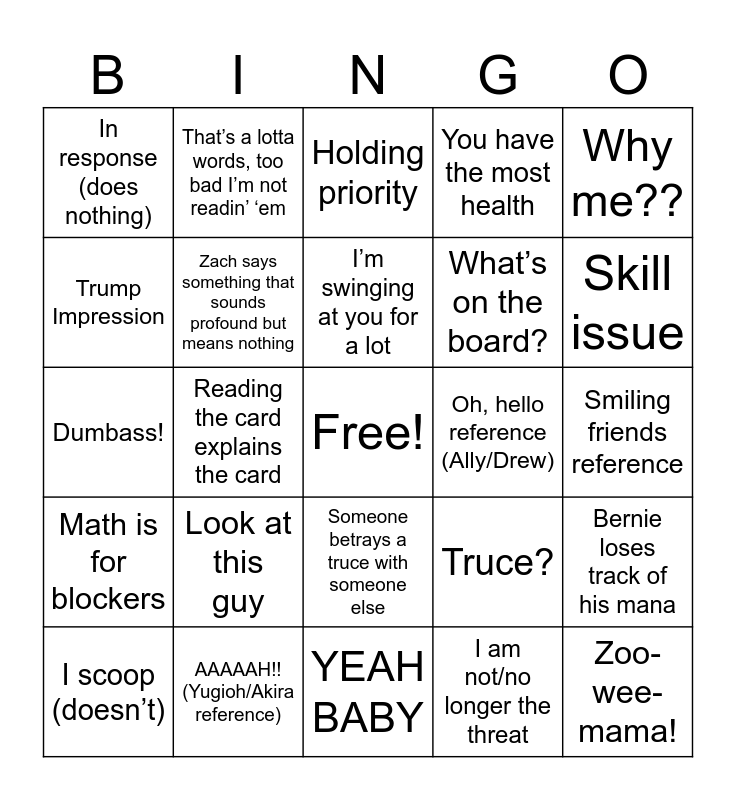 This bingo card has a free space and 29 words: I scoop (doesn’t), I have nothing, Reading the card explains the card, Threat assessment, In response (does nothing), Holding priority, Zach says something that sounds profound but means nothing, Look at this guy, Oh, hello reference (Ally/Drew), AAAAAH!! (Yugioh/Akira reference), Smiling friends reference, Zoo-wee-mama!, YEAH BABY, I am not/no longer the threat, Skill issue, That’s nasty, Someone betrays a truce with someone else, Math is for blockers, Why me??, Dumbass!, Truce?, 40 Dollar Card, What’s on the board?, Trump Impression, You have the most health, That’s a lotta words, too bad I’m not readin’ ‘em, Bernie loses track of his mana, I’m swinging at you for a lot and Someone straight up lies.
