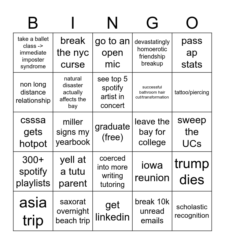 This bingo card has a free space and 24 words: yell at a tutu parent, saxorat overnight beach trip, see top 5 spotify artist in concert, asia trip, pass ap stats, take a ballet class -> immediate imposter syndrome, non long distance relationship, break the nyc curse, leave the bay for college, coerced into more writing tutoring, successful bathroom hair cut/transformation, csssa gets hotpot, iowa reunion, trump dies, natural disaster actually affects the bay, break 10k unread emails, sweep the UCs, go to an open mic, tattoo/piercing, miller signs my yearbook, scholastic recognition, 300+ spotify playlists, devastatingly homoerotic friendship breakup and get linkedin.