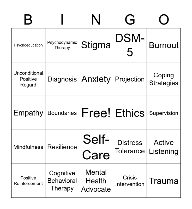 This bingo card has a free space and 40 words: Therapist, Empathy, Confidentiality, Diagnosis, Cognitive Behavioral Therapy, Self-Care, Anxiety, Depression, Burnout, Mindfulness, Boundaries, DSM-5, Trauma, Supervision, Ethics, Resilience, Rapport, Psychoeducation, Teletherapy, Stigma, Active Listening, Crisis Intervention, Projection, Unconditional Positive Regard, Intervention, Group Therapy, Behavior Modification, Self-Disclosure, Eclectic Therapy, Transference, Countertransference, Positive Reinforcement, Exposure Therapy, Distress Tolerance, Coping Strategies, Mental Health Advocate, Person-Centered Therapy, Motivational Interviewing, Psychodynamic Therapy and Behavioral Activation.