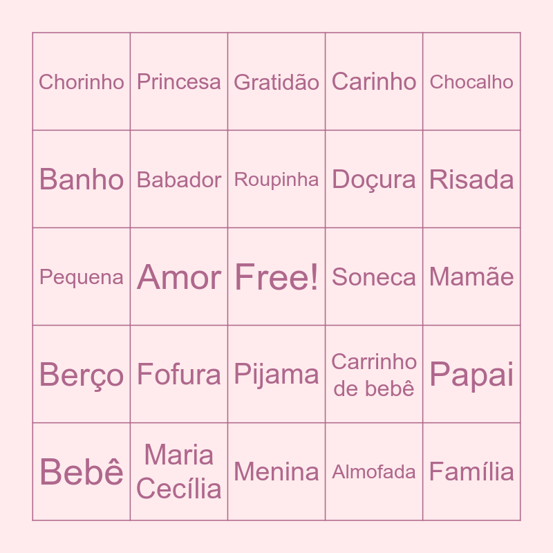 This bingo card has a free space and 36 words: Fralda, Mamadeira, Chupeta, Babador, Carrinho de bebê, Berço, Roupinha, Ursinho, Chocalho, Body, Amor, Carinho, Colo, Soneca, Risada, Chorinho, Primeiros passos, Fofura, Família, Gratidão, Mamãe, Papai, Maria Cecília, Bebê, Menina, Princesa, Pequena, Anjo, Doçura, Banho, Lencinho, Mordedor, Almofada, Pijama, Maternidade and Primeiros dentinhos.