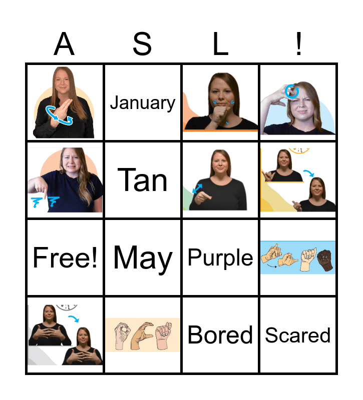 This bingo card has 27 images and 29 words: Free!, Free!, Bored, April, Black, Thursday, Red, Yellow, Tan, Purple, Orange, Scared, Oct, Nervous, January, Hurt, Gray, White, November, Green, Blue, February, Confused, May, Excited, Happy, December, Monday and Pink.