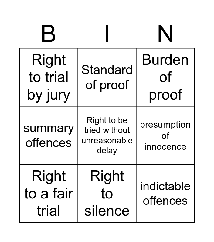 This bingo card has a free space and 8 words: presumption of innocence, Burden of proof, Standard of proof, Right to a fair trial, Right to trial by jury, indictable offences, summary offences and Right to silence.
