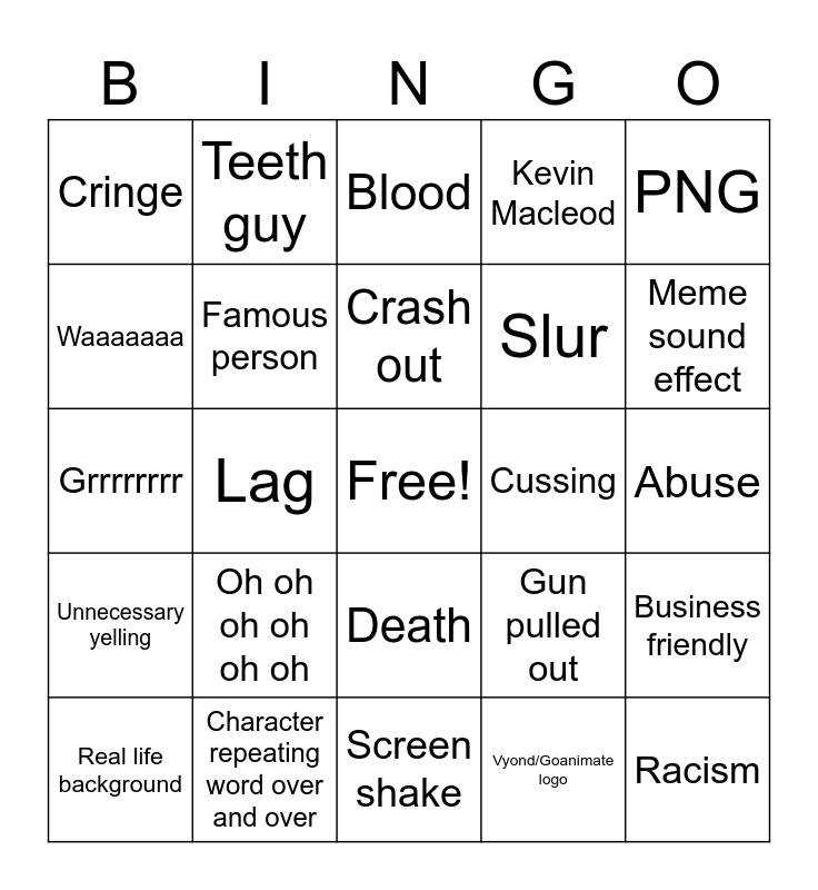 This bingo card has a free space and 24 words: Oh oh oh oh oh oh, Character repeating word over and over, Crash out, Real life background, PNG, Cringe, Waaaaaaa, Teeth guy, Cussing, Death, Slur, Grrrrrrrr, Gun pulled out, Business friendly, Famous person, Vyond/Goanimate logo, Abuse, Blood, Meme sound effect, Lag, Racism, Unnecessary yelling, Kevin Macleod and Screen shake.