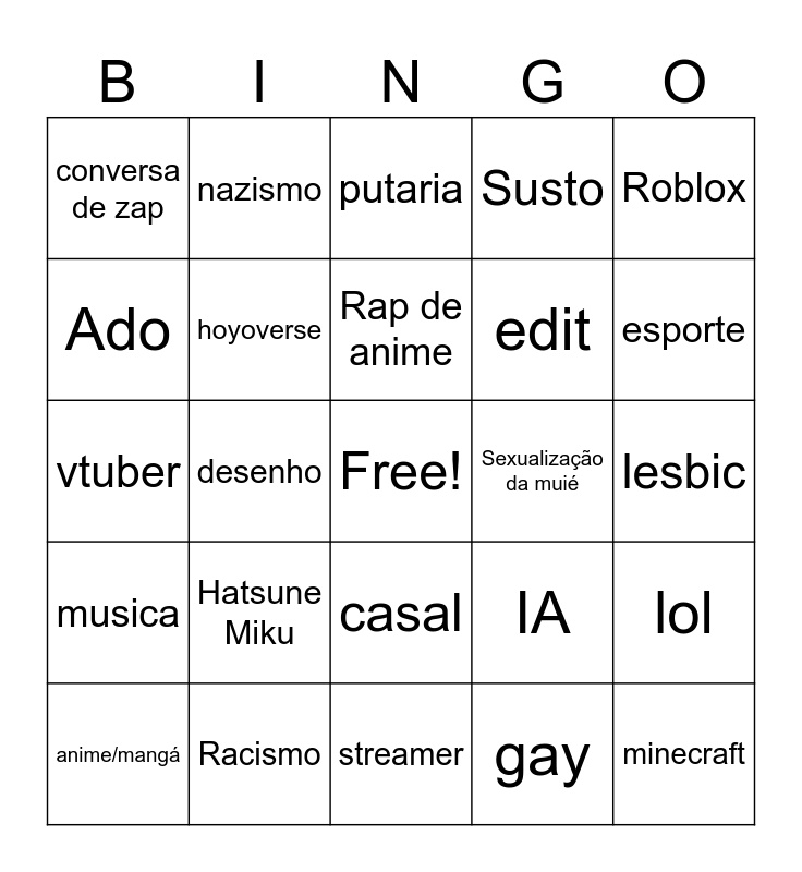This bingo card has a free space and 24 words: Hatsune Miku, Racismo, Rap de anime, anime/mangá, Roblox, conversa de zap, Ado, nazismo, Sexualização da muié, casal, edit, vtuber, IA, lol, hoyoverse, gay, lesbic, putaria, esporte, desenho, minecraft, musica, Susto and streamer.
