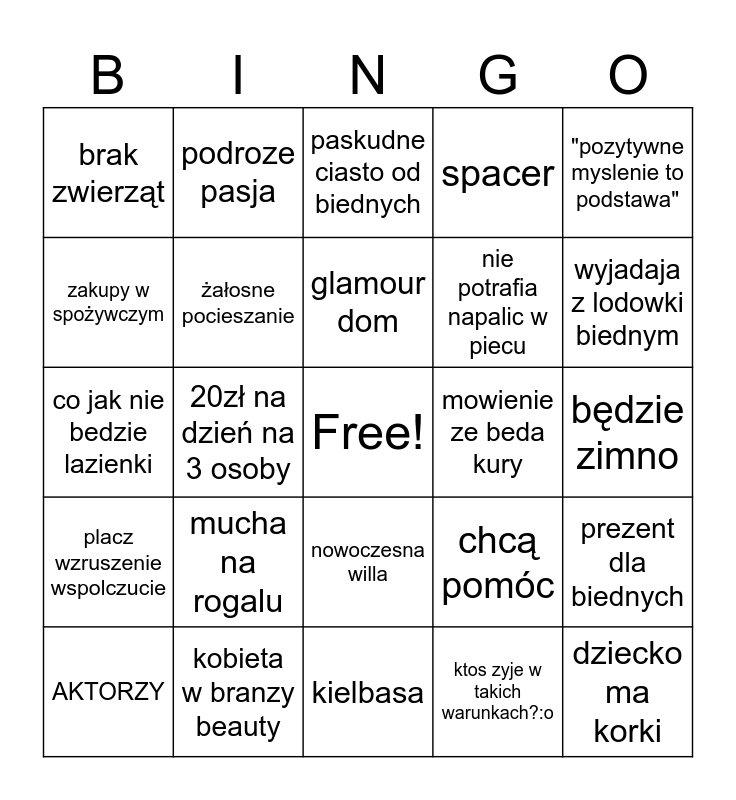This bingo card has a free space and 24 words: mucha na rogalu, kobieta w branzy beauty, glamour dom, AKTORZY, "pozytywne myslenie to podstawa", brak zwierząt, zakupy w spożywczym, podroze pasja, mowienie ze beda kury, nowoczesna willa, nie potrafia napalic w piecu, co jak nie bedzie lazienki, chcą pomóc, prezent dla biednych, żałosne pocieszanie, ktos zyje w takich warunkach?:o, będzie zimno, paskudne ciasto od biednych, wyjadaja z lodowki biednym, 20zł na dzień na 3 osoby, dziecko ma korki, placz wzruszenie wspolczucie, spacer and kielbasa.