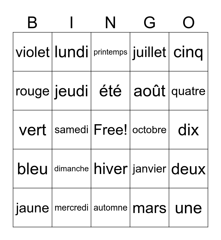 This bingo card has a free space and 24 words: jaune, dimanche, été, mars, cinq, violet, lundi, printemps, octobre, dix, vert, jeudi, janvier, deux, rouge, mercredi, automne, juillet, quatre, bleu, samedi, hiver, août and une.