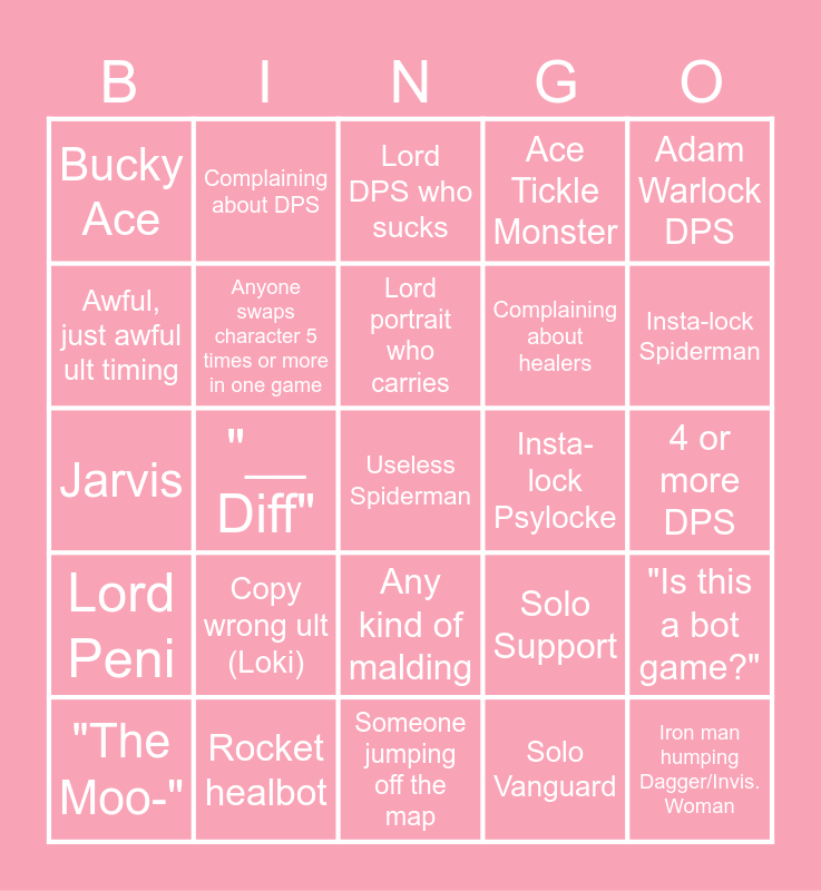 This bingo card has 25 words: Copy wrong ult (Loki), Someone jumping off the map, Lord portrait who carries, "The Moo-", Adam Warlock DPS, Bucky Ace, Awful, just awful ult timing, Complaining about DPS, Insta-lock Psylocke, Any kind of malding, Complaining about healers, Jarvis, Solo Support, "Is this a bot game?", Anyone swaps character 5 times or more in one game, Iron man humping Dagger/Invis. Woman, 4 or more DPS, Lord DPS who sucks, Insta-lock Spiderman, "__ Diff", Useless Spiderman, Rocket healbot, Lord Peni, Ace Tickle Monster and Solo Vanguard.