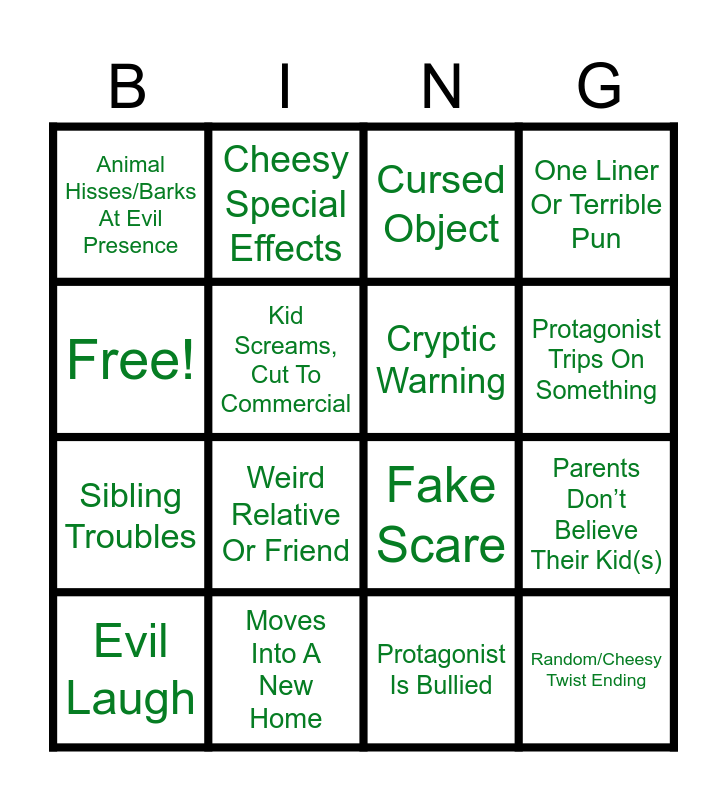 This bingo card has 16 words: Moves Into A New Home, Parents Don’t Believe Their Kid(s), Cursed Object, Animal Hisses/Barks At Evil Presence, Sibling Troubles, Cheesy Special Effects, Fake Scare, Protagonist Is Bullied, Free!, Kid Screams, Cut To Commercial, Evil Laugh, One Liner Or Terrible Pun, Weird Relative Or Friend, Protagonist Trips On Something, Cryptic Warning and Random/Cheesy Twist Ending.