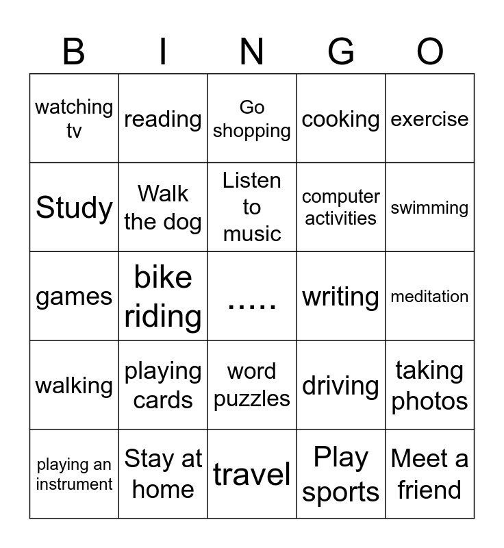 This bingo card has a free space and 24 words: playing cards, Stay at home, Listen to music, playing an instrument, exercise, watching tv, Study, reading, writing, word puzzles, computer activities, games, driving, taking photos, Walk the dog, Play sports, meditation, Go shopping, swimming, bike riding, Meet a friend, walking, cooking and travel.