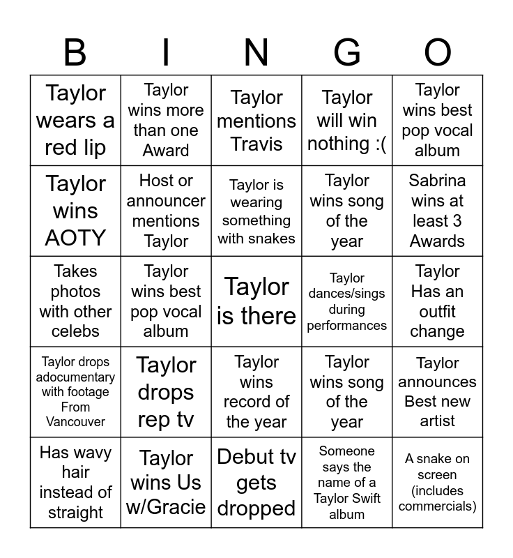 This bingo card has a free space and 24 words: Taylor drops rep tv, Taylor wins Us w/Gracie, Taylor is wearing something with snakes, Has wavy hair instead of straight, Taylor wins best pop vocal album, Taylor wears a red lip, Taylor wins AOTY, Taylor wins more than one Award, Taylor dances/sings during performances, Taylor wins record of the year, Taylor wins song of the year, Takes photos with other celebs, Taylor wins song of the year, Taylor announces Best new artist, Host or announcer mentions Taylor, Someone says the name of a Taylor Swift album, Taylor Has an outfit change, Taylor mentions Travis, Sabrina wins at least 3 Awards, Taylor wins best pop vocal album, A snake on screen (includes commercials), Taylor drops adocumentary with footage From Vancouver, Taylor will win nothing :( and Debut tv gets dropped.