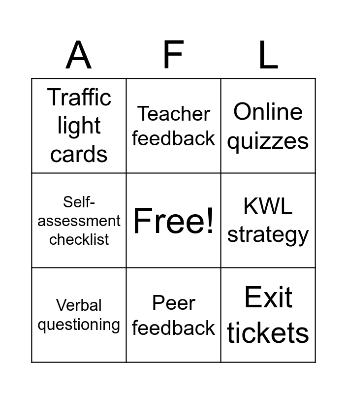 This bingo card has a free space and 9 words: Verbal questioning, Online quizzes, Teacher feedback, Self-assessment checklist, Traffic light cards, KWL strategy, Exit tickets, Peer evaluation and Peer feedback.