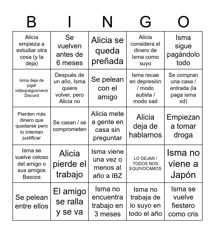 This bingo card has 25 words: Alicia pierde el trabajo, Isma no encuentra trabajo en 3 meses, Se pelean con el amigo, Se pelean entre ellos, Isma sigue pagándolo todo, Alicia empieza a estudiar otra cosa (y la deja), Isma deja de jugar videojuegos/venir Discord, Se vuelven antes de 6 meses, Alicia deja de hablarnos, Isma viene una vez o menos al año a IBZ, Isma recae en depresión / modo autista / modo sad, Pierden más dinero que quedarse pero lo intentan justificar, LO DEJAN / TODOS NOS EQUIVOCAMOS, Isma no viene a Japón, Después de un año, Isma quiere volver, pero Alicia no, Isma se vuelve fiestero como cris, Empiezan a tomar droga, Alicia se queda preñada, Se compran una casa / entrada (la paga isma xd), Se casan / se comprometen, Alicia mete a gente en casa sin preguntar, El amigo se ralla y se va, Isma se vuelve celoso del amigo o sus amigos Bascos, Alicia considera el dinero de Isma como suyo and Isma no trabaja de lo suyo en todo el año.