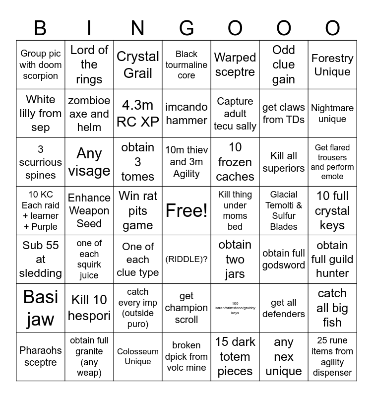 This bingo card has a free space and 48 words: Sub 55 at sledding, Enhance Weapon Seed, Colosseum Unique, (RIDDLE)?, Capture adult tecu sally, Glacial Temolti & Sulfur Blades, Forestry Unique, Pharaohs sceptre, Any visage, Win rat pits game, Black tourmaline core, Warped sceptre, Kill all superiors, Get flared trousers and perform emote, 10 KC Each raid + learner + Purple, Kill 10 hespori, Crystal Grail, 10m thiev and 3m Agility, 100 larran/brimstone/grubby keys, Odd clue gain, Nightmare unique, White lilly from sep, Lord of the rings, 4.3m RC XP, 15 dark totem pieces, get claws from TDs, 10 full crystal keys, Basi jaw, one of each squirk juice, obtain 3 tomes, get champion scroll, 10 frozen caches, get all defenders, catch all big fish, Group pic with doom scorpion, obtain full granite (any weap), One of each clue type, broken dpick from volc mine, Kill thing under moms bed, any nex unique, obtain full guild hunter, 3 scurrious spines, zombioe axe and helm, catch every imp (outside puro), imcando hammer, obtain two jars, obtain full godsword and 25 rune items from agility dispenser.