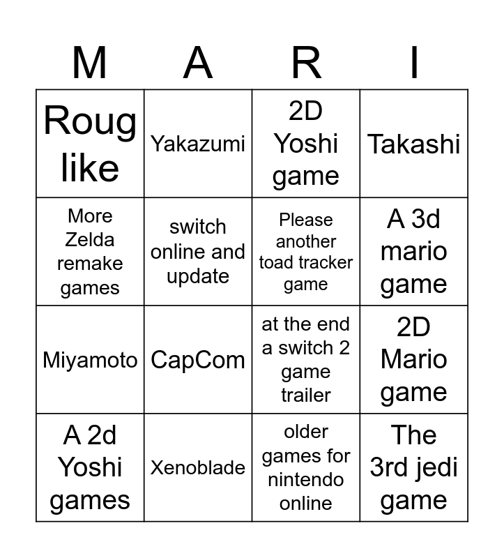 This bingo card has 16 words: Xenoblade, 2D Mario game, 2D Yoshi game, Roug like, Miyamoto, Yakazumi, at the end a switch 2 game trailer, older games for nintendo online, More Zelda remake games, switch online and update, A 2d Yoshi games, Takashi, CapCom, A 3d mario game, Please another toad tracker game and The 3rd jedi game.
