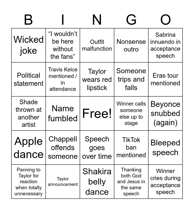 This bingo card has a free space and 24 words: Chappell offends someone, Taylor announcement, Taylor wears red lipstick, Panning to Taylor for reaction when totally unnecessary, Sabrina innuendo in acceptance speech, Wicked joke, Political statement, “I wouldn’t be here without the fans”, Winner calls someone else up to stage, Speech goes over time, Someone trips and falls, Shade thrown at another artist, TikTok ban mentioned, Bleeped speech, Travis Kelce mentioned / in attendance, Thanking both God and Jesus in the same speech, Beyonce snubbed (again), Outfit malfunction, Eras tour mentioned, Name fumbled, Winner cries during acceptance speech, Apple dance, Nonsense outro and Shakira belly dance.