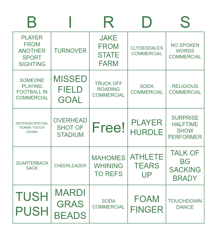 This bingo card has a free space and 24 words: CHEERLEADER, MARDI GRAS BEADS, TRUCK OFF ROADING COMMERCIAL, TUSH PUSH, NO SPOKEN WORDS COMMERCIAL, PLAYER FROM ANOTHER SPORT SIGHTING, SOMEONE PLAYING FOOTBALL IN COMMERCIAL, TURNOVER, PLAYER HURDLE, MAHOMES WHINING TO REFS, SODA COMMERCIAL, DEFENSE/SPECIAL TEAMS TOUCH DOWN, ATHLETE TEARS UP, TALK OF BG SACKING BRADY, MISSED FIELD GOAL, FOAM FINGER, SURPRISE HALFTIME SHOW PERFORMER, JAKE FROM STATE FARM, RELIGIOUS COMMERCIAL, OVERHEAD SHOT OF STADIUM, TOUCHDOWN DANCE, QUARTERBACK SACK, CLYDESDALES COMMERCIAL and SODA COMMERCIAL.