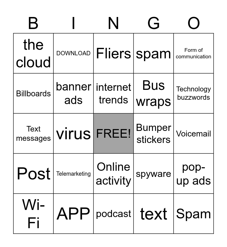 This bingo card has a free space and 26 words: Online activity, text, internet trends, APP, Form of communication, the cloud, Billboards, DOWNLOAD, Voicemail, spyware, Bus wraps, Text messages, pop-up ads, Wi-Fi, virus, blog, spam, Post, Fliers, Spam, Technology buzzwords, podcast, Bumper stickers, Telemarketing, banner ads and FREE (this one is a gift, you got lucky).