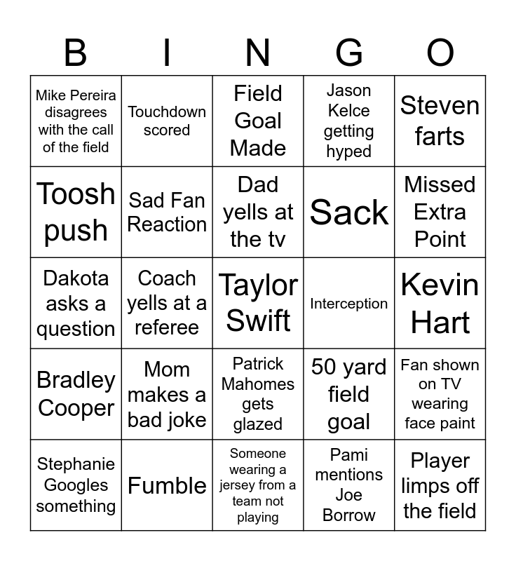 This bingo card has a free space and 24 words: Stephanie Googles something, Mom makes a bad joke, Dad yells at the tv, Pami mentions Joe Borrow, Steven farts, Mike Pereira disagrees with the call of the field, Touchdown scored, Field Goal Made, Interception, Kevin Hart, Dakota asks a question, Sad Fan Reaction, 50 yard field goal, Fan shown on TV wearing face paint, Toosh push, Fumble, Someone wearing a jersey from a team not playing, Jason Kelce getting hyped, Missed Extra Point, Bradley Cooper, Coach yells at a referee, Patrick Mahomes gets glazed, Sack and Player limps off the field.