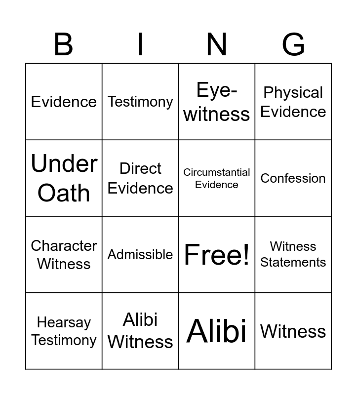 This bingo card has 16 words: Alibi Witness, Witness Statements, Eye-witness, Evidence, Character Witness, Testimony, Free!, Alibi, Under Oath, Direct Evidence, Hearsay Testimony, Physical Evidence, Admissible, Confession, Circumstantial Evidence and Witness.
