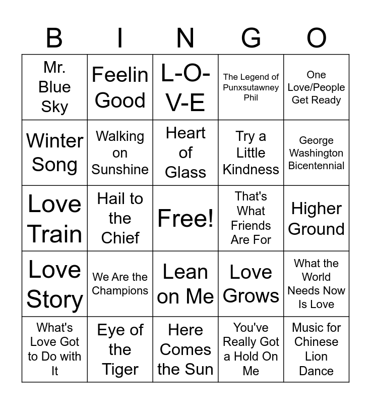 This bingo card has a free space and 24 words: We Are the Champions, Eye of the Tiger, Heart of Glass, What's Love Got to Do with It, One Love/People Get Ready, Mr. Blue Sky, Winter Song, Feelin Good, That's What Friends Are For, Lean on Me, Try a Little Kindness, Love Train, Love Grows, What the World Needs Now Is Love, Walking on Sunshine, You've Really Got a Hold On Me, Higher Ground, L-O- V-E, George Washington Bicentennial, Hail to the Chief, Music for Chinese Lion Dance, Love Story, The Legend of Punxsutawney Phil and Here Comes the Sun.