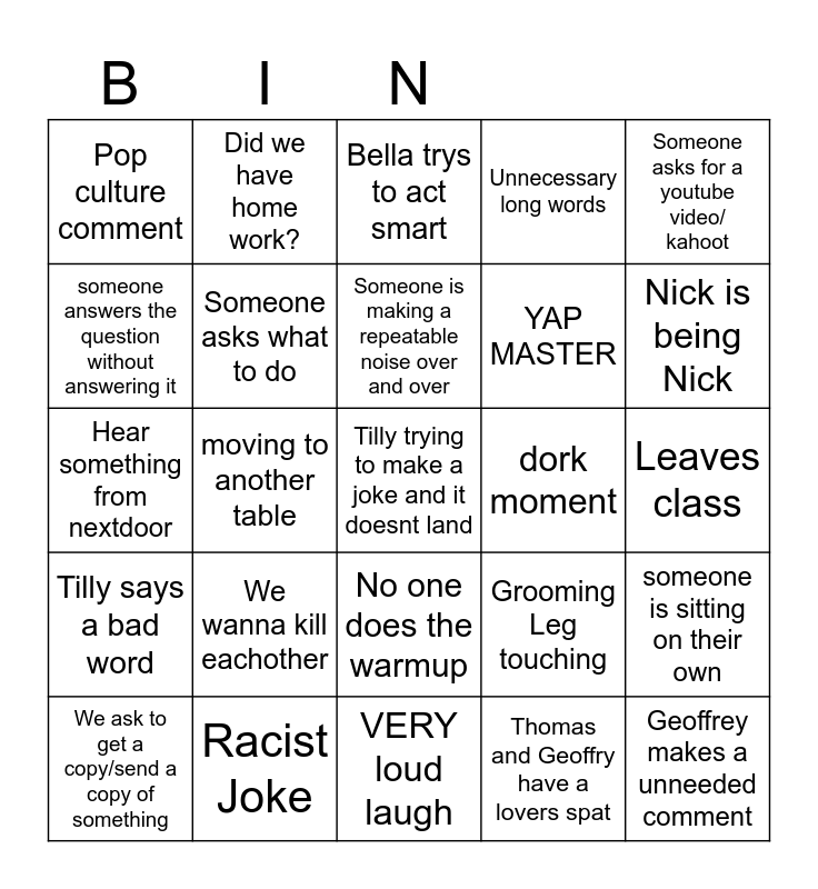 This bingo card has 34 words: Geoffrey makes a unneeded comment, Thomas and Geoffry have a lovers spat, Emma answers two questions in a row, Hear about Bellas personal life, Tilly says a bad word, Someone asks what to do, Someone asks for a youtube video/ kahoot, We ask to get a copy/send a copy of something, Did we have home work?, Tilly has to calm down the class, Someone is making a repeatable noise over and over, Bella trys to act smart, Free!, Change of seating postions, dork moment, Nick is being Nick, Racist Joke, Hear something from nextdoor, We wanna kill eachother, Grooming Leg touching, No one does the warmup, Someone saying something about 'locking in', Pop culture comment, Leaves class, VERY loud laugh, Tilly trying to make a joke and it doesnt land, Unnecessary long words, no ones doing the activity, YAP MASTER, someone answers the question without answering it, someone is sent out because of a water bottle, moving to another table, someone is sitting on their own and CRASH OUTTTTTT.