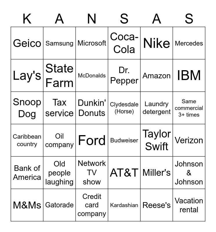 This bingo card has 54 words: Doritos, Clydesdale (Horse), Dog, Old people laughing, Same commercial 3+ times, Vacation rental, Coca-Cola, Pepsi, Mercedes, Toyota, Geico, Kardashian, Budweiser, Ford, Planet Fitness, Taylor Swift, Snoop Dog, McDonalds, Free!, Dunkin' Donuts, Caribbean country, Network TV show, Tax service, Nike, Apple, Samsung, M&Ms, T-Mobile, AT&T, Verizon, Cheetos, Credit card company, KitKat, Google, Microsoft, Reese's, Amazon, Oil company, Bank of America, Lay's, Audi, Snickers, Kia, School bus, Laundry detergent, Mt. Dew, Gatorade, Miller's, State Farm, IBM, Dr. Pepper, Chiefs Player, Johnson & Johnson and Eagles Player.