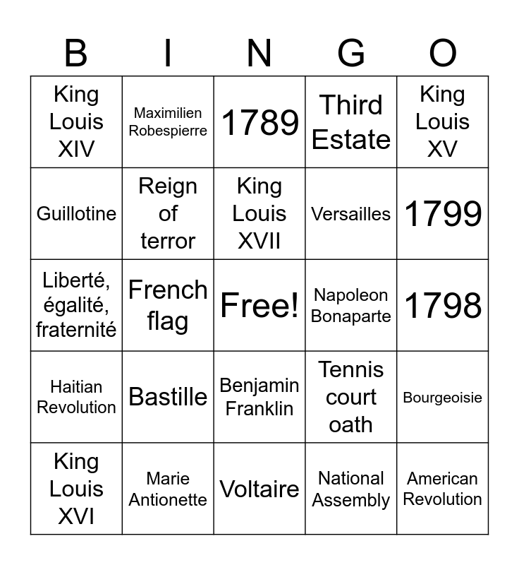 This bingo card has a free space and 24 words: Bastille, Marie Antionette, King Louis XVII, King Louis XVI, King Louis XV, King Louis XIV, Guillotine, Maximilien Robespierre, Napoleon Bonaparte, Benjamin Franklin, Versailles, Liberté, égalité, fraternité, Tennis court oath, Bourgeoisie, Reign of terror, National Assembly, 1798, 1789, 1799, French flag, American Revolution, Haitian Revolution, Third Estate and Voltaire.