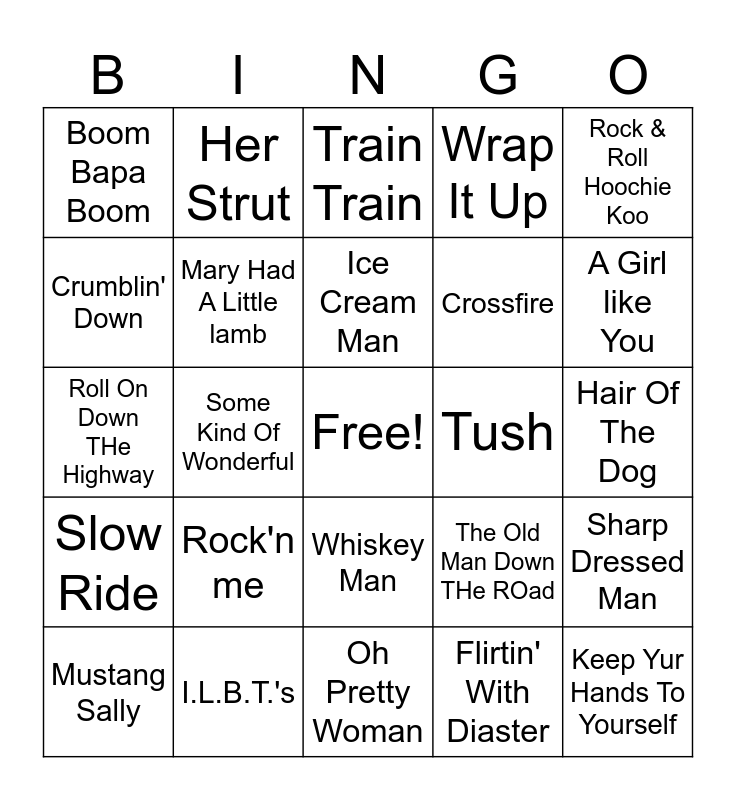 This bingo card has a free space and 55 words: Hoochie Coochie Man, Mustang Sally, Powerful Stuff, Boom Bapa Boom, Oh Pretty Woman, Let The Good Times Roll, Mary Had A Little lamb, The House Is Rockin', Crossfire, Tuff Enuff, Wrap It Up, Pride & Joy, Rockin' At Midnight, Boys Are Back In Town, Move It On Over, I'm Tore Down, Rock & Roll Hoochie Koo, Some Kind Of Wonderful, Get A Haircut, Keep Yur Hands To Yourself, Tush, Spirit In THe Sky, The Old Man Down THe ROad, Train Train, Hard To Handle, Ice Cream Man, Flirtin' With Diaster, We're An American band, Hair Of The Dog, Sharp Dressed Man, Legs, Tobacco Road, Authority Song, Radioactive, Crumblin' Down, Roll On Down THe Highway, Rain On The Scarecrow, Slow Ride, Rock N Roll Fantasy, Paper In Fire, Her Strut, Got Me Under Pressure, Twilight Zone, Midnight Rider, Rock'n me, I.L.B.T.'s, Rockin' Into The Night, Snortin' Whiskey, Fantasy, A Girl like You, Yankee Rose, Play Guitar, Let It Roll, Whiskey Man and Tube Snake Boogie.
