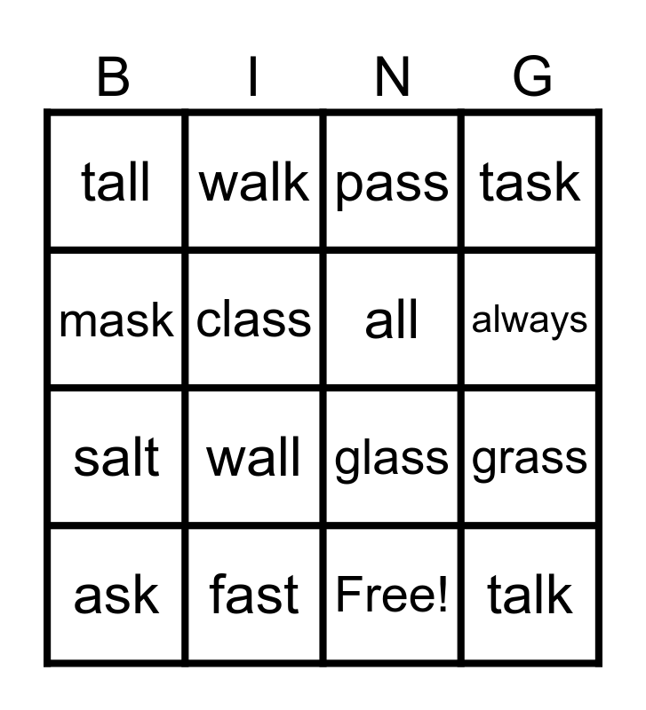 This bingo card has 17 words: Free!, ask, pass, tall, wall, task, grass, all, always, class, fast, glass, mask, walk, salt, ball and talk.