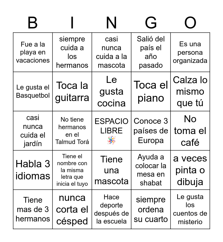 This bingo card has a free space and 39 words: Viajó a Israel en vacaciones, Le gusta leer, Es zurdo, Toca la guitarra, Tiene mas de 3 hermanos, Tiene una mascota, Le gusta cocina, Cumpleaños en vacaciones, Es una persona organizada, Habla 3 idiomas, No tiene hermanos en el Talmud Torá, Salió del país el año pasado, Le gusta los cuentos de misterio, No toma el café, Conoce 3 países de Europa, Tiene el nombre con la misma letra que inicia el tuyo, Le gusta el picante, Fue a la playa en vacaciones, Cumpleaños en purim, Ayuda a colocar la mesa en shabat, Le gusta el Basquetbol, Hace deporte después de la escuela, Toca el piano, Calza lo mismo que tú, toma el té, no le gusta pasear al perro, no le gusta tomar café, rara vez ve películas, nunca cocina, siempre cuida a los hermanos, hace la tarea todos los días, practica deportes casi siempre, casi nunca cuida a la mascota, nunca corta el césped, siempre ordena su cuarto, limpia el baño, a veces pinta o dibuja, casi nunca cuida el jardín and nunca practica deportes.