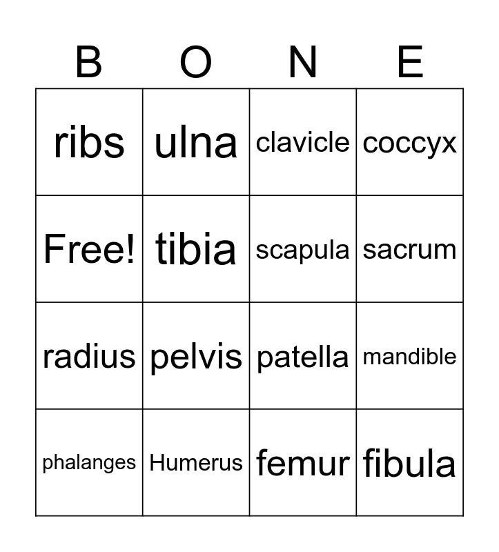 This bingo card has 16 words: Humerus, mandible, clavicle, ribs, radius, ulna, patella, femur, Free!, tibia, phalanges, coccyx, pelvis, sacrum, scapula and fibula.