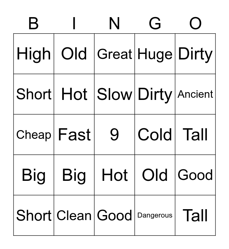 This bingo card has a free space and 45 words: Single, Tall, Slow, Short, Fast, Dangerous, Great, Healthy, Dirty, Clean, Huge, Cold, Hot, Big, Large, Good, Expensive, Cheap, Friendly, Ancient, Old, Young, Poor, High, Single, Tall, Friendly, Ancient, Old, Big, Large, Good, Clean, Huge, Cold, Fast, Dangerous, Great, Expensive, Slow, Short, Dirty, Healthy, Hot and Cheap.