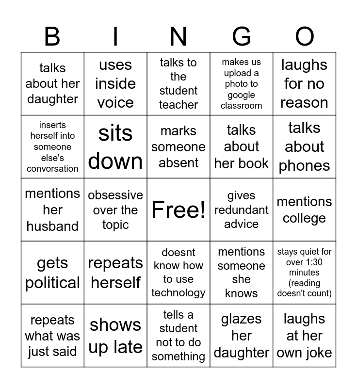 This bingo card has a free space and 24 words: repeats herself, shows up late, marks someone absent, repeats what was just said, laughs for no reason, talks about her daughter, inserts herself into someone else's convorsation, uses inside voice, gives redundant advice, doesnt know how to use technology, talks about her book, mentions her husband, mentions someone she knows, stays quiet for over 1:30 minutes (reading doesn't count), sits down, glazes her daughter, mentions college, talks to the student teacher, talks about phones, obsessive over the topic, laughs at her own joke, gets political, makes us upload a photo to google classroom and tells a student not to do something.