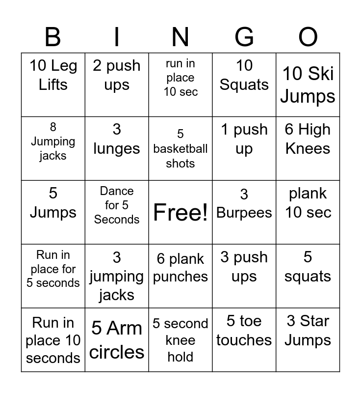 This bingo card has a free space and 24 words: 3 jumping jacks, 5 Arm circles, 5 basketball shots, Run in place 10 seconds, 10 Ski Jumps, 10 Leg Lifts, 8 Jumping jacks, 2 push ups, 3 Burpees, 6 plank punches, 1 push up, 5 Jumps, 3 push ups, 5 squats, 3 lunges, 5 toe touches, plank 10 sec, run in place 10 sec, 6 High Knees, Dance for 5 Seconds, 3 Star Jumps, Run in place for 5 seconds, 10 Squats and 5 second knee hold.