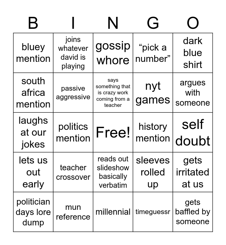 This bingo card has a free space and 28 words: gets irritated at us, gives up teaching, nyt games, timeguessr, south africa mention, gossip whore, joins whatever david is playing, lets us out early, history mention, politician days lore dump, laughs at our jokes, “pick a number”, mun reference, millennial, argues with someone, hand gestures w/ laptop, teacher crossover, passive aggressive, says something that is crazy work coming from a teacher, reads out slideshow basically verbatim, bluey mention, just straight up leaves, gets baffled by someone, politics mention, self doubt, sleeves rolled up, dark blue shirt and cpers mention.