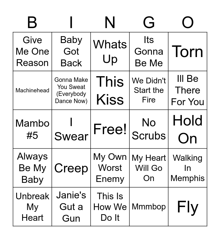 This bingo card has a free space and 100 words: Poison, Nothing Compares to You, Hold On, It Must Have Been Love, Vogue, Vision of Love, Another Day in Paradise, Cradle of Love, Pump Up the Jam, Black Velvet, Step by Step, Ice Ice Baby, U Cant Touch This, Janie's Gut a Gun, The Humpty Dance, Free Fallin, We Didn't Start the Fire, The Sign, Wannabe, I Want It That Way, Baby One More Time, Ready Or Not, The Boy is Mine, Barbie Girl, Man! I Feel Like A Woman, No Scrubs, Torn, My Heart Will Go On, Gangstas Paradise, Tubthumping, I Swear, Give Me One Reason, Genie In a Bottle, All Star, Mmmbop, This Kiss, Walking In Memphis, Gettin Jiggy With It, Breakfast at Tiffanys, Bitch, Only Wanna Be With You, Mr Jones, Mambo #5, Ironic, Ill Be There For You, Whats Up, Waterfalls, Larger Than Life, Fantasy, This Is How We Do It, Baby I love your way, Here Comes the Hot Stepper, Boombastic, All I Wanna Do, Kiss From A Rose, Just A Friend, Love Shack, Say My Name, Doo Wop (That Thing), Its Gonna Be Me, Smells Like Teen Spirit, Thunderstruck, Oops I Did It Again, Zombie, Ghetto Supastar, All The Small Things, Chattahoochee, I Like It I Love It, You Aint Much Fun, Be My Baby Tonight, I Feel Lucky, Creep, Californication, Black Hole Sun, Heart-Shaped Box, Sex and Candy, Don't Speak, Machinehead, Waiting For Tonight, You Get What You Give, Jump, Fly, What Is Love, My Own Worst Enemy, Livin’ La Vida Loca, Baby Got Back, Tearin’ Up My Heart, Macarena, Whatta Man, Always Be My Baby, I Believe I Can Fly, Achy Breaky Heart, Wonderwall, Unbreak My Heart, Gonna Make You Sweat (Everybody Dance Now), I Will Always Love You, Wide Open Spaces, Whoomp There It Is, Hard Knock Life and Loser.