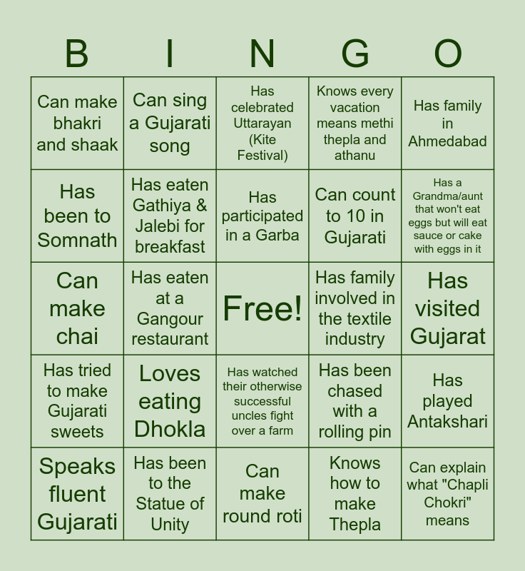 This bingo card has a free space and 24 words: Speaks fluent Gujarati, Loves eating Dhokla, Has participated in a Garba, Knows how to make Thepla, Has family in Ahmedabad, Can make bhakri and shaak, Can sing a Gujarati song, Has celebrated Uttarayan (Kite Festival), Has family involved in the textile industry, Has visited Gujarat, Can make chai, Has eaten Gathiya & Jalebi for breakfast, Has been chased with a rolling pin, Has played Antakshari, Has been to Somnath, Has been to the Statue of Unity, Can make round roti, Knows every vacation means methi thepla and athanu, Has a Grandma/aunt that won't eat eggs but will eat sauce or cake with eggs in it, Has tried to make Gujarati sweets, Has eaten at a Gangour restaurant, Has watched their otherwise successful uncles fight over a farm, Can count to 10 in Gujarati and Can explain what "Chapli Chokri" means.