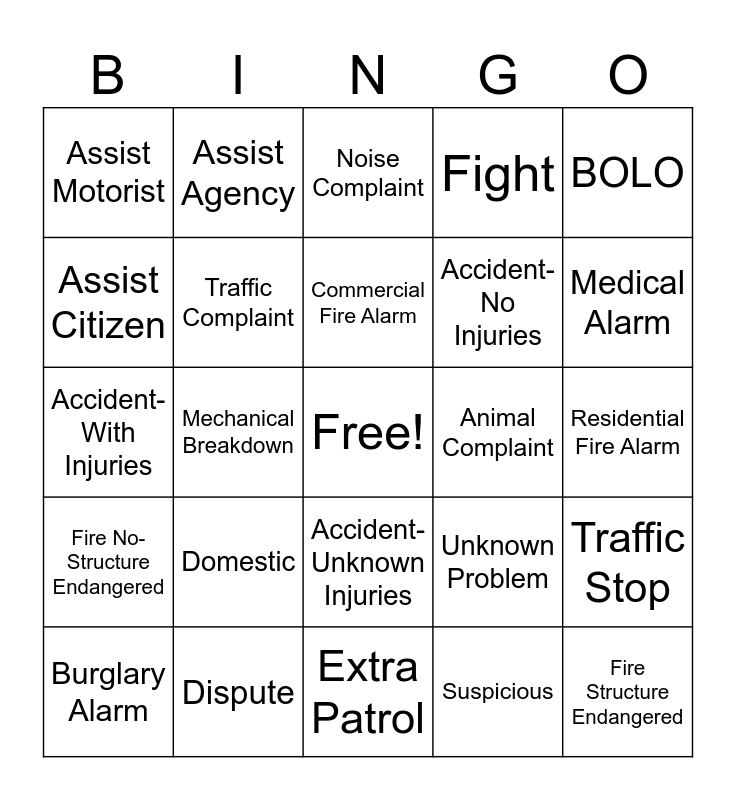 This bingo card has a free space and 24 words: Domestic, Dispute, Commercial Fire Alarm, Burglary Alarm, BOLO, Assist Motorist, Assist Citizen, Assist Agency, Animal Complaint, Accident-Unknown Injuries, Accident-No Injuries, Accident- With Injuries, Unknown Problem, Traffic Stop, Traffic Complaint, Suspicious, Residential Fire Alarm, Noise Complaint, Medical Alarm, Mechanical Breakdown, Fire Structure Endangered, Fire No-Structure Endangered, Fight and Extra Patrol.