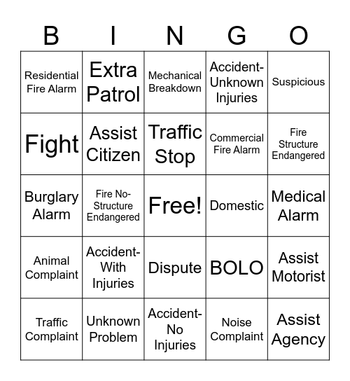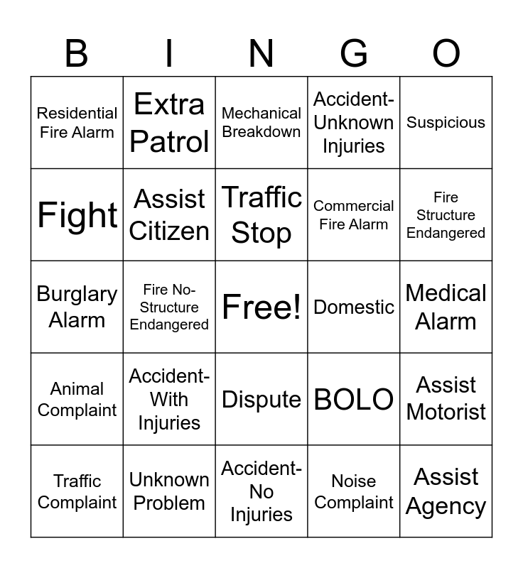 This bingo card has a free space and 24 words: Accident- With Injuries, Unknown Problem, Traffic Stop, Traffic Complaint, Suspicious, Residential Fire Alarm, Fight, Extra Patrol, Domestic, Dispute, Commercial Fire Alarm, Burglary Alarm, BOLO, Assist Motorist, Assist Citizen, Noise Complaint, Medical Alarm, Mechanical Breakdown, Fire Structure Endangered, Fire No-Structure Endangered, Assist Agency, Animal Complaint, Accident-Unknown Injuries and Accident-No Injuries.