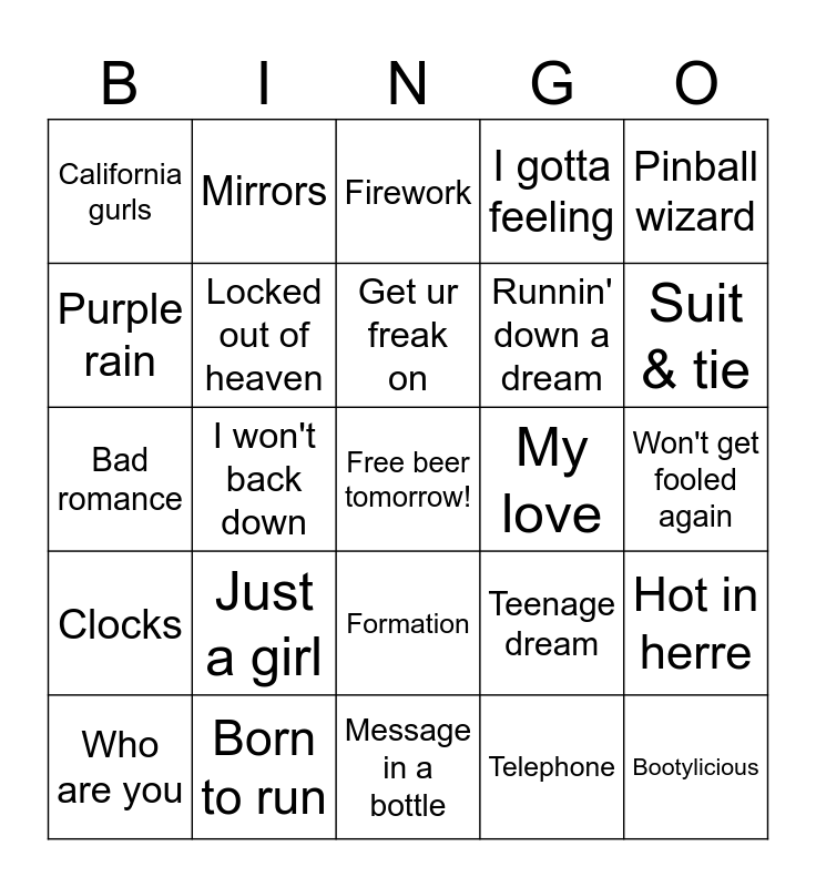 This bingo card has a free space and 48 words: Express yourself, Bootylicious, Glory days, Message in a bottle, Just a girl, Give it away, Mirrors, Vogue, Purple rain, Cry me a river, Locked out of heaven, I gotta feeling, Hot in herre, Teenage dream, Single ladies (put a ring on it), Man! I feel like a woman, Get ur freak on, My love, Independent women, Pinball wizard, I won't back down, Telephone, California gurls, Runnin' down a dream, Get back, Suit & tie, Who are you, Uptown funk, Formation, Clocks, My girl, Fix you, Live and let die, Free fallin', Born to run, SexyBack, Beautiful day, Won't get fooled again, Like a prayer, The tears of a clown, I don't want to miss a thing, Crazy in love, Firework, Where the streets have no name, Bad romance, Yellow, (I can't get no) satisfaction and Hey jude.